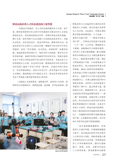 一是强化学科建设,为人才队伍建设提供有力支撑。近年来,陕西坚持把哲学社会科学学科建设作为推动社科人才队伍建设的龙头,依托国家级重点学科、省级社科重点研究基地、博士点和一级学科授予点以及博士后科研流动站等平台,对接社会需求,高位顶层设计,优化学科布局,凝练学科方向,促进高校哲学社会科学人才队伍发展。根据哲学社会科学学科发展规律,坚持“科学规划,突出特色,协调发展”的建设思路,推进优势学科发展壮大,特色学科与时俱进,新兴交叉学科异峰突起,基础学科重点突破的学科发展方向,积极打造具有各个学校自身特色的哲学社会科学学科体系,为高层次人才培养提供有力支撑。经过多年发展,陕西高校哲学社会科学在学科设置上涵盖了所有门类和一级学科,呈现出学科门类齐全、综合性强的特点。西北大学考古学、西安交通大学马克思主义理论、陕西师范大学中国语言文学、西安美术学院美术学等多个学科进入教育部学科评估A类学科。