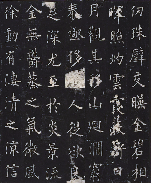 《 九成宫碑》是唐贞观六年( 632)由魏徵撰文,欧阳询书丹而成,立于陕西麟游九成宫中。立碑未久,即为学欧书者捶拓,经后人多次开凿,现存于麟游县九成宫遗址碑亭景区内。碑文歌颂了唐太宗的文治武功和节俭精神,提出了“居高思坠,持满戒盈”的谏诤之言。全碑结体修长,中宫收紧,四边开张,左敛右纵;字形随势赋形,其左右结构作相背之势,上下结构呈上窄下宽之形,间架开阔稳定,血脉畅通,气韵萧然,历来为学书者推崇,视为楷书之正宗。