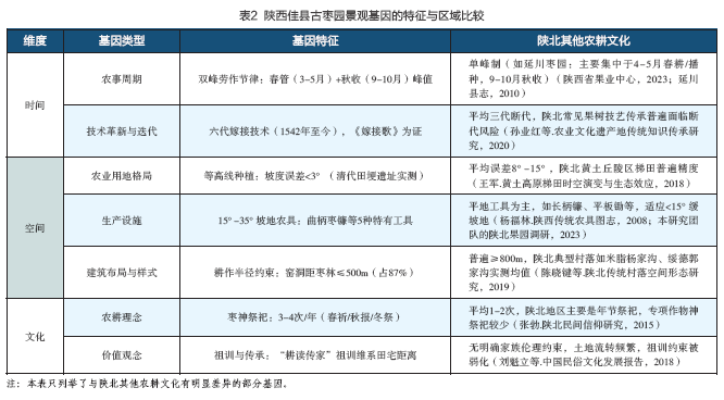为凸显佳县古枣园景观基因的独特性,将其核心特征与陕北地区其他具有代表性的农耕文化(如延川枣园、清涧苹果园等)进行对比(见表2) 。