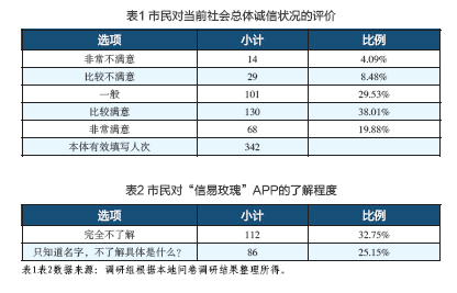 护也有欠缺。尽管设立了“诚信克拉玛依”网站和微信小程序,但信息覆盖面不广,推广持续性不足。以“信易玫瑰”项目为例的网上问卷调查显示,342份问卷中,42.1%的受访者对当前社会总体诚信状况不满意, 57. 9%的市民对“信易玫瑰”APP不完全了解(见表1、表2) 。