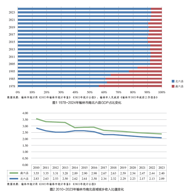 从纵向变化来看,1980年至2024年,榆林市城乡居民收入(绝对值)差距逐年增大,但城乡收入比值(相对差距)由1990年的不断增大,转向2010年后的持续缩小。横向比较来看,2023年榆林市居民人均可支配收入仅次于西安,增长速度较快,但低于全省平均水平,与全国平均水平相差7327元,其中城镇居民人均可支配收入低于西安、咸阳、延安,增长速度高于全省、全国平均水平。农村居民人均可支配收入仅次于西安,增长速度低于省内平均水平,但高于全国平均水平。城乡居民收入比值为2.34,低于全省、全国平均水平,城乡二元结构改善质量明显。分区域来看,2023年榆林市北六县城乡居民收入高于全市平均水平,城乡收入比值低于全市水平,城乡收入差距较小,南六县则相反。但南六县城乡收入增速高于北六县,扶助政策效果明显。从动态变化来看,2010-2023年,北六县