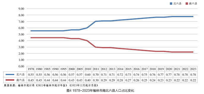 改革开放以来,榆林市南六县人口占比由1978年的44.61%,减少到2023年的21.76%(见图4),人口流失极其严重。