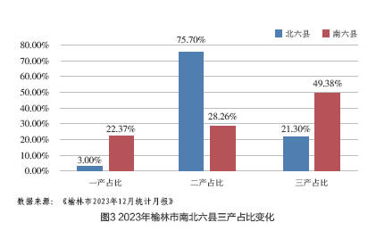 2023年,榆林市完成规上工业总产值8441亿元,工业增加值增长5% ,与全省持平,工业增加值总量占全省40%以上,连续17年稳居全省第一,其中,以煤炭、油气开采等为主的能源工业占规上工业总产值比重连续十几年维持在80%左右。分区域来看,北部县区资源富集,以能源化工为主导产业(见图3),产业结构单一,二产占比较高,但产业纵向延伸不够,延链、补链工作刚刚开始,随着全球能源格局的变化和“双碳”目标的提出,作为首批低碳试点城市,在聚力建设能源技术革命示范区的目标下,北部县区能化产业绿色低碳转型升级压力巨大,二产独大的产业结构一方面降低了其经济韧性,另一方面也可能陷入所谓“资源诅咒”。南部县区属特色生态产业区,以一、三产业为主导产业(见图3),重点发展文化旅游、特色农业、农副产品加工、生物医药等产业,但由于经济基础较弱,旅游产业相关配套基础设施建设不足,旅游业发展疲软,特色农业比如山地苹果、小杂粮、中药材等资源较多,但深加工不足,产品附加值低,宣传不到位,在市场上不具有竞争力。随着经济发展差距不断拉大,产业断层愈发严重,南六县在产业后续发展中表现出明显的后劲不足,呈现出多元化和复杂化的趋势。