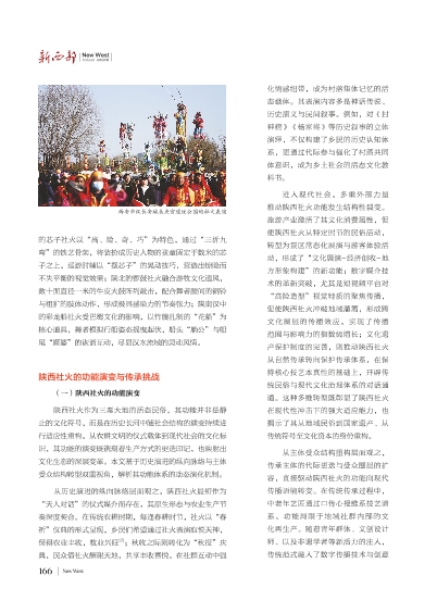 进入现代社会,多重外部力量推动陕西社火功能发生结构性裂变。旅游产业激活了其文化消费属性,促使陕西社火从特定时节的民俗活动,转型为景区常态化展演与游客体验活动,形成了“文化展演-经济创收-地方形象构建”的新功能;数字媒介技术的革新突破,尤其是短视频平台对“高险造型”视觉特质的聚焦传播,促使陕西社火冲破地域藩篱,形成跨文化圈层的传播效应,实现了传播范围与影响力的指数级增长;文化遗产保护制度的完善,则推动陕西社火从自然传承转向保护传承体系,在保持核心技艺本真性的基础上,开辟传统民俗与现代文化治理体系的对话通道。这种多维转型既彰显了陕西社火在现代性冲击下的强大适应能力,也揭示了其从地域民俗到国家遗产、从传统符号至文化资本的身份重构。