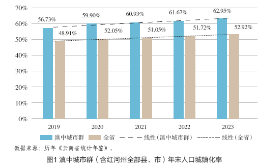 城市群的人口聚集量逐步提高,城市体系初步形成。2024年滇中城市群(含红河州全部县、市)总人口为2199.16万人,全省常住人口为4655万人,已占全省人口的47.24% 。 在[1]“强省会”战略的实施下,作为省会城市的昆明,城市首位度持续提高已成为全省经济发展的龙头。2024年滇中城市群(含红河州全部县、市)地区GDP为19538.93亿元,占全省的61.96% 。分城市来看,昆明市占全省的26.24%,曲靖占全省的11.66% ;玉溪占全省的8.19%,楚雄占全省的 6.40% ,红河(含红河州全部县、市)[2]占全省9 .47% 。 滇中城市群已形成一个特大城市(昆明)、一个大城市(曲靖),一个中等城市(玉溪) 、一个托管的口岸(磨憨)城市以及一系列中小城镇构成的城市群。图1为近5年根据统计年鉴数据测算的滇中城市人口城镇化率,反映出近5年来滇中城市群人口城镇化率持续提升。