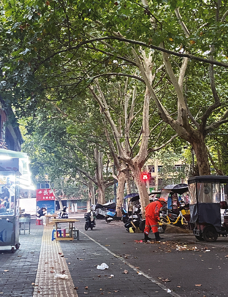后来有一个下午,我又路过雷师傅负责的街区,我看到脱去雨衣的雷云财师傅,低头用力地推扫着落叶,弯着腰,腿还半蹲,矮小的身体佝偻在橙色工服里。