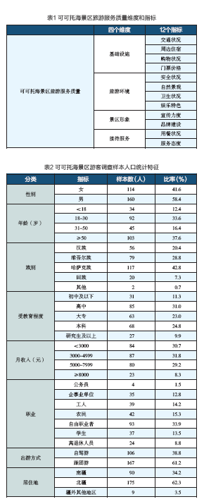 可可托海景区位于新疆维吾尔自治区富蕴县境内,是一个因矿而生的重要旅游目的地,具有极其深厚的红色历史文化底蕴。可可托海拥有得天独厚的资源优势,是一个融阿尔泰山地特有的山景、水景、草原、奇特象形山石、淘金、温泉等奇观于一体的丰富自然景观组合区 。全国8大主类31[10 ]个亚类155个基本类型的旅游资源中,可可托海景区八大类型全部具备,基本类型旅游资源类型占国家标准的[11]19.4% 。 2017年5月5日,联合国教科文组织执行局第201次会议决定,正式批准新疆可可托海国家地质公园加入世界地质公园网络,成为我国第35家、新疆首家联合国教科文组织世界[1 2]地质公园 。 本研究以可可托海景区为案例,通过了解游客对可可托海景区“基础设施”“旅游环境”“景区形象”和“接待服务”等方面的满意度现状调查,深入探究可可托海景区旅游服务提升策略。