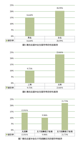不同的薪酬报酬会对学生见习的留存率造成影响,对高校应届毕业生留存率的报酬区间差异进行统计,得出不同报酬区间的留存率数据(见图7)。由图可见,报酬高于标准数的留存率最高、报酬低于标准数的留存率最低。