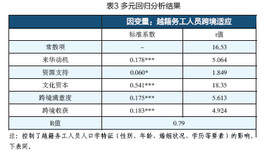 研究对越籍务工人员跨境适应性影响因素进行多元回归分析后,得到如下结果:研究构建的回归分析模型,其值介于0.745至0.901之间。这些数据表明,建构的模型能够分别解释因变量变化的74.5%至90.1%之间,显示出各自变量具有较强的解释能力。同时,模型中所有自变量的p值均小于0.001,表明自变量与因变量之间存在显著的关系(具体可见表1和表2) 。