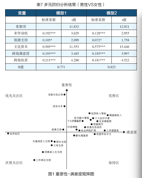 通过改变样本的范围或构成,观察回归结果是否保持一致,以判断回归方程的稳健性。据此,本研究按照性别分类对样本进行分组,男性样本构建回归模型1,女性样本构建回归模型2,经检验,结果如表7所示,来华动机、资源支持、文化资本、跨境满意度、跨境收获仍然对越籍务工人员社会适应性具有显著的正相关,文化资本对务工人员社会适应性的影响程度更大。这也证实了前文的论证结果是稳定可靠的。
