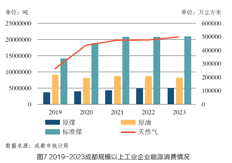 从出口型企业出口商品的结构来看,2024年成都出口贸易呈现“机电主导强化、新能源崛起、特色农产品助力、传统产业收缩”的特征。成都机电产品长期保持绝对优势,新能源产品出口大幅增长,特色农产品出口稳步提升,低附加值产品出口比重下降。在所有机电产品中,自动数据处理设备零部件出口占比38%,电子元件出口占比22%。此外,2024年前11个月,四川省平板电脑、汽车、家用电器出口分别增长19.8% 、 12.7% 、11.9% , 机电产品的规模优势与结构优化并行,助力成都出口转型升级。然而,机电产品的能源消耗以电力为主,高能耗问题依然突出。自2019年至2023年,成都规模以上工业企业能源消费总量逐年上升(如图7所示) ,能源结构亟须优化。